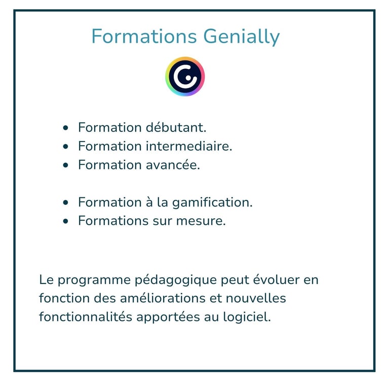 Je suis également Ambassadrice Genially et organise dans le cadre de mes fonctions des ateliers decouvertes. Mon statut me permet d'être informé des nouvelles fonctionnalités en avant première et ainsi de vous proposer des formations qui exploitent tout le potentiel du logiciel.